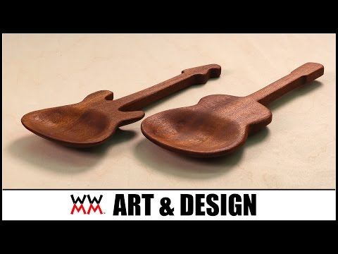 Making wooden spoons is similar to making cutting boards: they both seem to be projects that every woodworker will eventually attempt. Typically, spoons are hollowed out and shaped using carving knives and chisels, but I used my power tools instead. I also opted for non-traditional spoon shapes, making and acoustic guitar and an electric guitar. The wood is mahogany. These are not the most practical utensils but intended as decorative pieces for hanging on the wall.